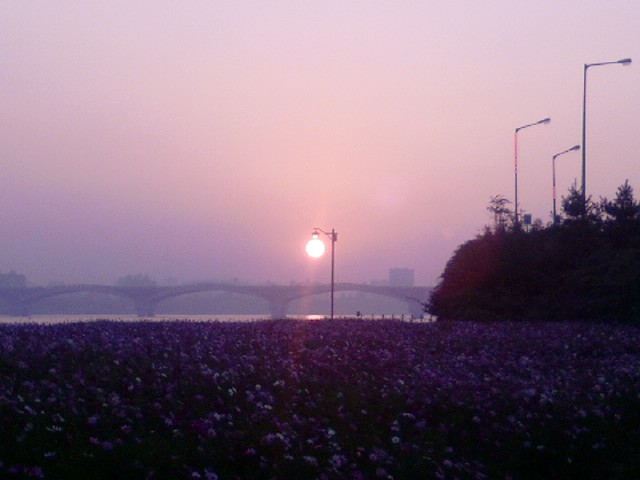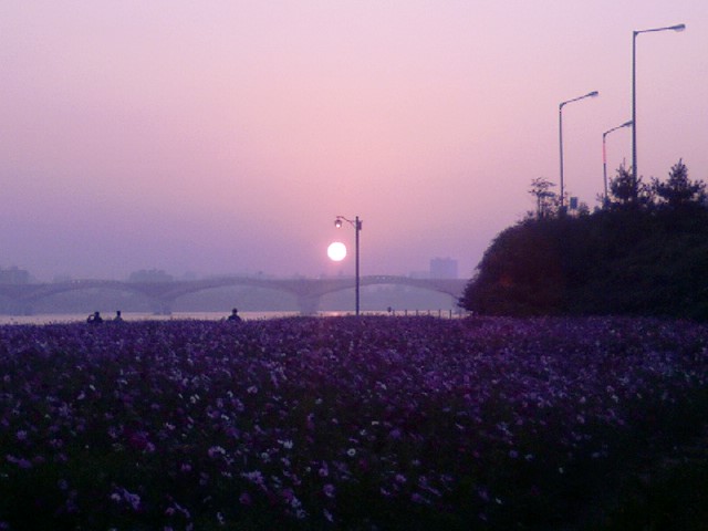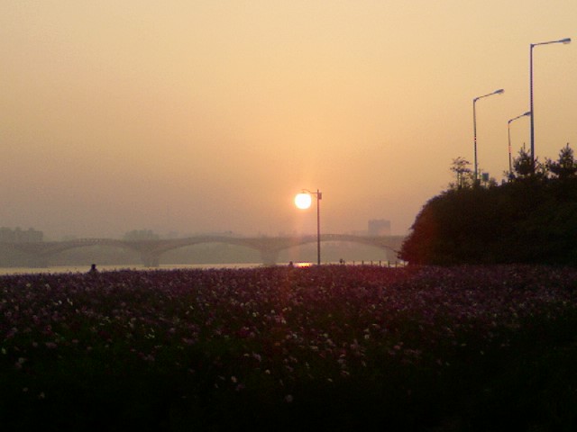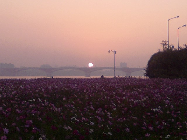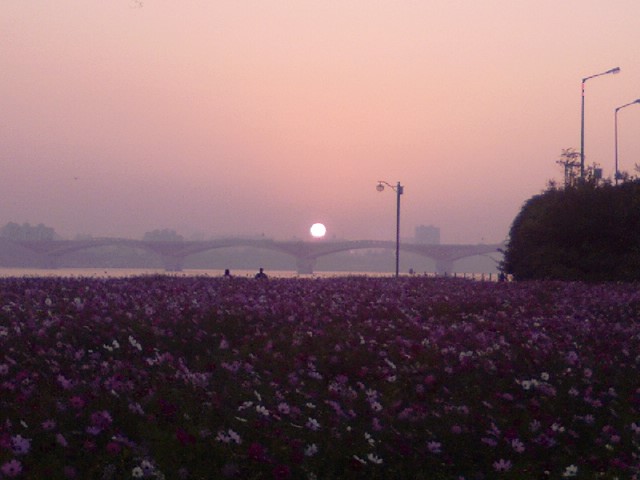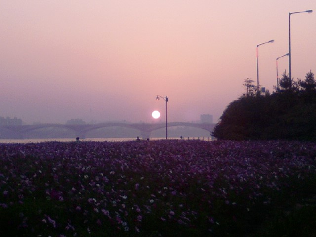 성산대교위로 뻘건 태양이 솟아올라 코스모스들의 시선을 모으는데